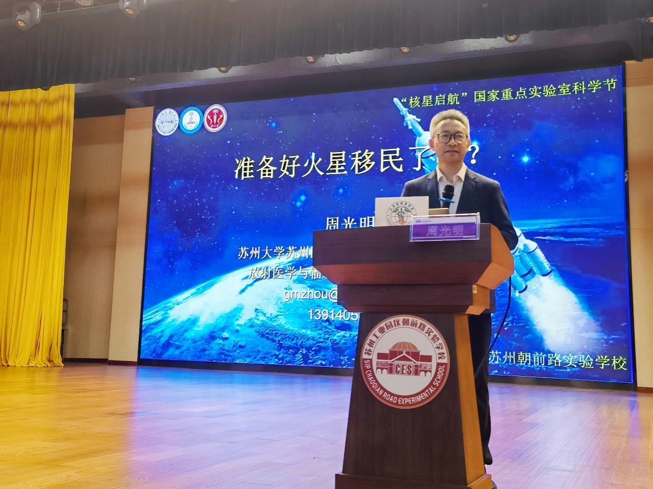 周光明致辞中表示:当今是科技创新的时代,核技术已在医疗健康、核环保、载人航天、考古等领域广泛应用,与大家的生活息息相关。放射医学与辐射防护国家重点实验室源起于1964年成立的苏州医学院放射医学系,是服务于我国“两弹一艇”计划而建立。以柴之芳院士为代表的一大批科学家坚持发扬“两弹一星”的精神和新时代科学家精神,在放射医学及核技术应用领域取得了一大批科研成果,积极响应国家“科学普及”和“科技创新”两翼齐飞号召,针对“恐核”、“谈核色变”等社会现象,坚持核技术知识科学传播,推动科技成果科普化。希望通过科学节活动,提升青少年科学素养,让科学的种子生根、发芽、开花、结果。
