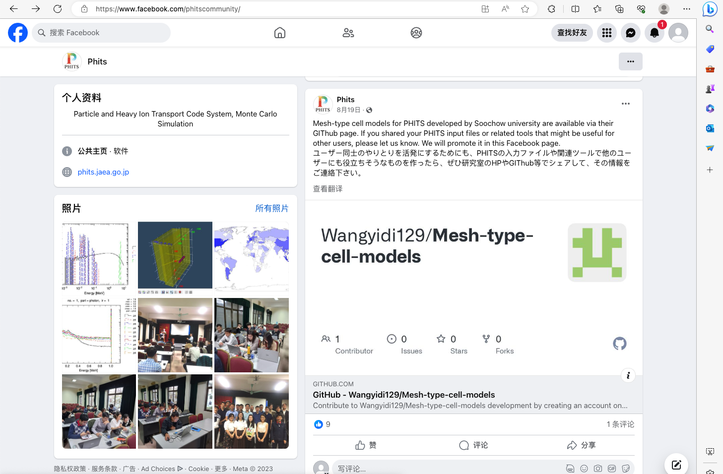 近期,苏州大学放射医学与防护学院国家重点实验室孙亮副教授及其团队围绕“细胞曲面模型的构建及其微、纳剂量学研究” 在“RADIATION RESEARCH”和“Radiation Physics and Chemistry”杂志上发表系列研究论文。该工作中构建的多种人类正常细胞的曲面单细胞模型获得了国际知名蒙卡软件PHITS官方的关注和应用,并在其官方平台(Facebook)上发文推广(图1)。