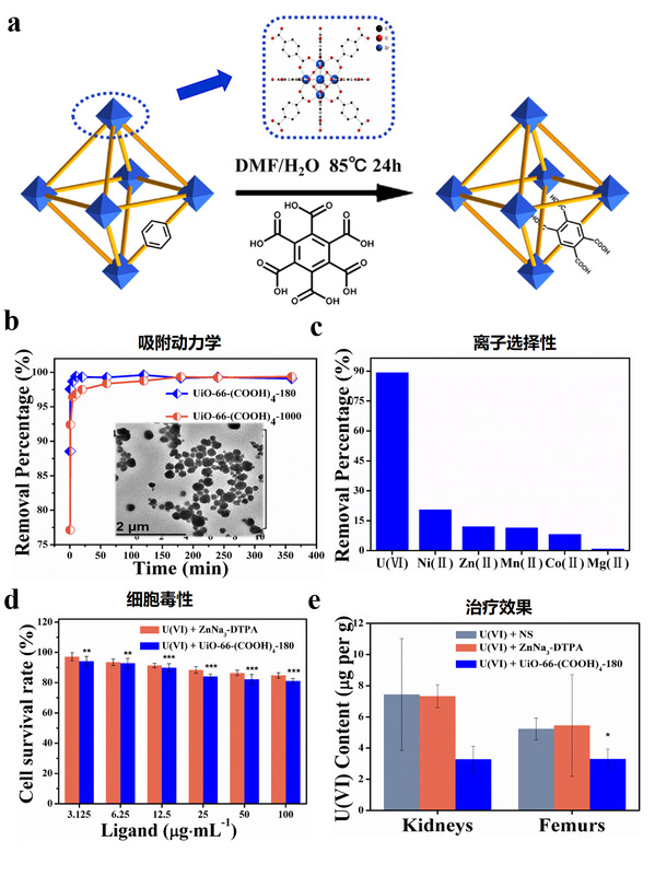 国重室第五娟教授课题组长期致力于研发新型高效低毒的锕系元素促排剂。在本工作中,以纳米尺寸的羧酸功能化金属有机框架材料(UiO-66-(COOH)4-180)为研究对象,通过体外吸附实验、细胞毒性实验、代谢动力学研究和小鼠个体水平的促排效果评价探索了纳米MOF材料在减少体内铀沉积率方面的潜力。