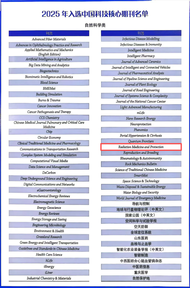 2025年10月30日,中国科学技术信息研究所在北京举行“2025年中国科技论文统计结果发布会”,会上发布了《2025年中国科技核心期刊目录》。由中国疾病预防控制中心辐射防护与核安全医学所、苏州大学放射医学与防护学院暨放射医学与辐射防护国家重点实验室联合创办的放射医学与防护英文刊《Radiation Medicine and Protection》入选2025“中国科技核心期刊(自然科学类)”。