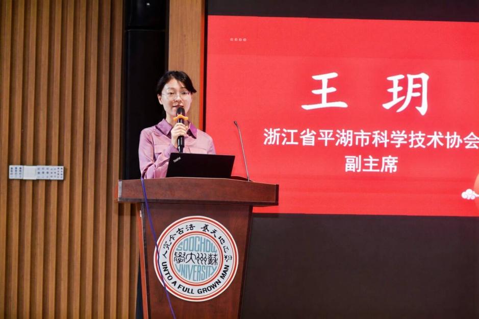平湖市科协王玥主席致辞,在全国科技活动周暨科技工作者日期间,平湖市科协与苏州大学放射医学国重室深化合作,连续举办 “鸿辐杯” 青少年核科普创新创业大赛,培育出大批展现创新思维与探索精神的青少年科技作品。为响应国家科技自强战略,双方将进一步深化科教融合,通过 “与核同行” 等特色活动厚植青少年家国情怀,持续为全民科学素养提升注入创新动能。她期待各界共筑科技强国人才基石,并预祝本次活动激发更多科学梦想。