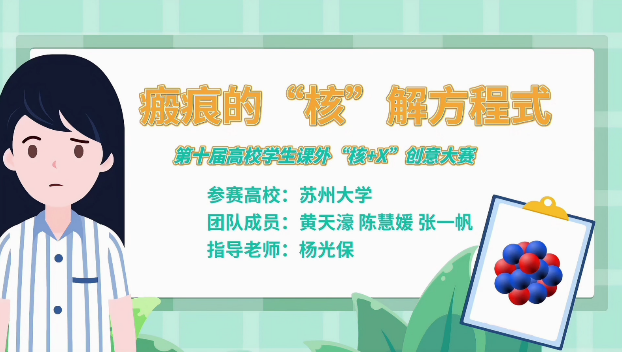 作品《瘢痕的“核”解方程式》以核素敷贴治疗技术为主题,通过瘢痕患者的故事切入,以造假核素贴为剧情反转点,生动讲解核素敷贴治疗原理,并创新改编“核素敷贴disco”科普歌曲,轻松传递核医学知识,破除公众误解。