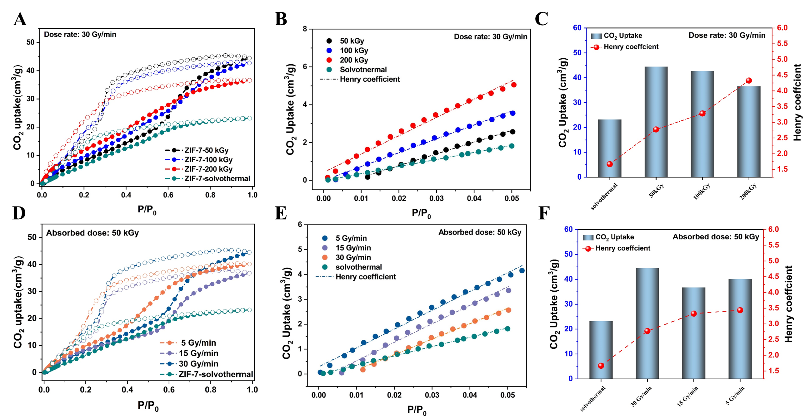 图三 辐射合成富缺陷ZIF-7框架材料的二氧化碳吸附性能表征