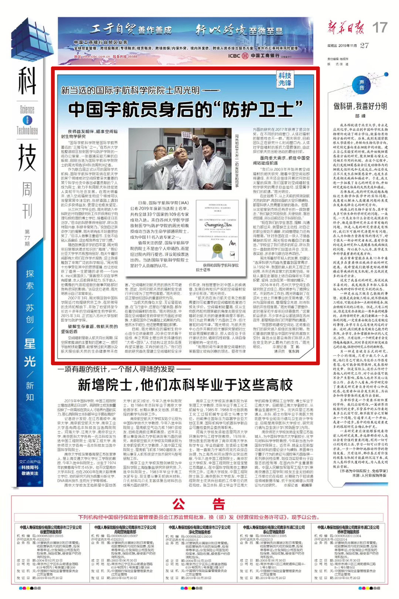 日前,国际宇航科学院(IAA)公布2019年度新当选院士名单,共有全球33个国家的109名专家成功入选。来自苏州大学医学部放射医学与防护学院的周光明教授成功当选为生命学部通讯院士,成为中国11名入选专家之一。