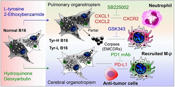 饮食来源的酪氨酸能够调节黑色素瘤进展已得到广泛认可。然而,以酪氨酸为底物的黑色素合成代谢是否参与黑色素瘤的亲器官定植仍然未知,此外,通过靶向酪氨酸酶活性来抑制黑色素瘤细胞多器官转移的方法依然需要被设计和验证。在本研究中,研究者首先发现黑色素瘤患者来源的黑色素瘤细胞以及小鼠黑色素瘤细胞利用酪氨酸合成黑色素的效率存在明显的异质性特征。研究人员利用细胞克隆以及高浓度酪氨酸筛选的方法,将黑色素瘤分为两个主要亚群:一类细胞高表达酪氨酸酶,高效/无节制地利用酪氨酸合成黑色素(Tyr-H cells);另一类细胞低表达酪氨酸酶,低效/不能利用酪氨酸合成黑色素(Tyr-L cells)。有趣的是,Tyr-H黑色素瘤细胞高效定植于肺组织,低效定植于脑组织,而Tyr-L黑色素瘤细胞高效定植于脑组织,低效定植于肺组织。