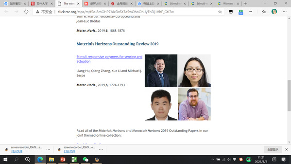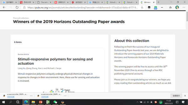 胡亮副教授及其合作者撰写的SCI论文“Stimuli responsive polymers for sensing and actuation,Mater. Horiz., 2019, 6, 1774-1793”,在该杂志(一区,影响因子=12.319)2020年的评审中,获得Horizons杰出论文奖(Winners of the 2019 Horizons Outstanding Paper awards)。