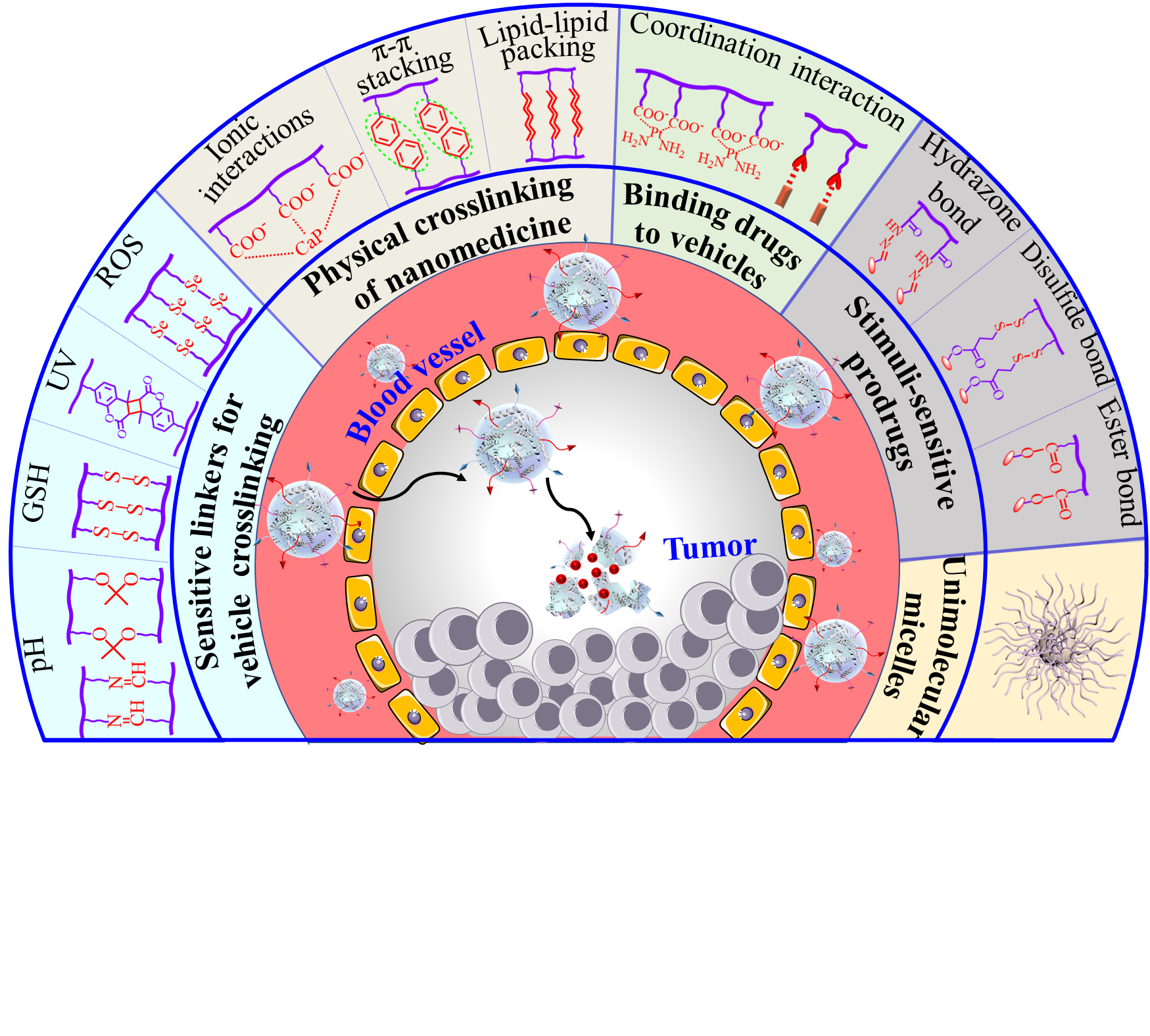 纳米药物因具有比传统药物更优越的安全性和更好的治疗效果而被广泛地用于多种疾病的治疗。合成聚多肽具有良好的生物相容性,能批量生产以及多功能性(可与化药和生物药相互作用或键合),因而由其构建的纳米载体已成为肿瘤治疗中最通用和最先进的纳米平台。当前已有多种聚多肽纳米药物进入到临床测试,用来治疗乳腺癌、肺癌、卵巢癌、胰腺癌、结直肠癌等各种实体瘤。临床结果显示这些纳米药物能极大地降低药物的全身毒副作用、提高用药的安全性,同时也发现纳米药物动态稳定性(即在血液循环中稳定而到达肿瘤后快速裂解释放包载的药物)对抗肿瘤效果起到至关重要的作用。最近,人们利用不同策略设计制备了多种动态稳定的聚多肽纳米药物。这些策略包括:(i)用酸、活性氧(ROS)、谷胱甘肽或光敏感键来交联制备动态纳米载体;(ii)通过动态协同作用将药物结合到纳米载体中;(iii)引入π-π堆积,脂质-脂质等作用力来构建动态纳米载体;(iv)将药物通过动态化学键结合到纳米载体中,(v)制备单分子纳米胶束(图1)。这些结构稳定的智能纳米药物在不同肿瘤模型中展现出了增强的肿瘤靶向性,提高的抗肿瘤功效和良好的安全性。