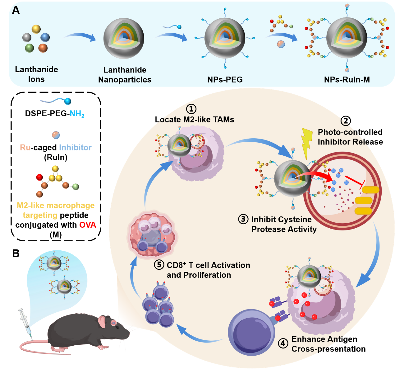 在前期研究中,研究团队构建了一系列基于稀土纳米颗粒的多模态分子影像探针,实现了GBM以及M2型TAMs的精准靶向成像(Biomaterials,2018, 175, 30-43;Biomaterials, 2019, 219, 119364;Nano Today, 2020, 34, 100905;Sci. Bull., 2022, 67, 461-465;Adv. Healthcare Mater., 2022, 11, 2102042;Small Methods, 2022, 6, 2101145;Small, 2022, 18, 2202201)。在此基础上,研究团队设计合成了可以靶向增强M2型TAMs抗原交叉呈递能力的光响应性纳米探针。该纳米探针由稀土纳米颗粒、耦联卵清蛋白(OVA)的M2型巨噬细胞靶向肽、半胱氨酸蛋白酶抑制剂组成。首先,基于纳米探针的NIR IIb成像(1500-1700 nm)精准定位GBM中的M2型TAMs;其次,纳米探针的上转换发射能够触发半胱氨酸蛋白酶抑制剂的响应释放,有效抑制M2型TAMs的半胱氨酸蛋白酶活性,从而显著增强其抗原交叉呈递能力。更重要的是,GBM内M2型TAMs的抗原交叉呈递能力优于DCs的抗原呈递能力,通过将纳米探针携带的OVA抗原呈递给T细胞,有效地促进CD8+ T细胞的活化和增殖,进而抑制肿瘤生长,显著提高了GBM小鼠的存活率。本研究为增强GBM免疫治疗提供了新思路和新方法。
