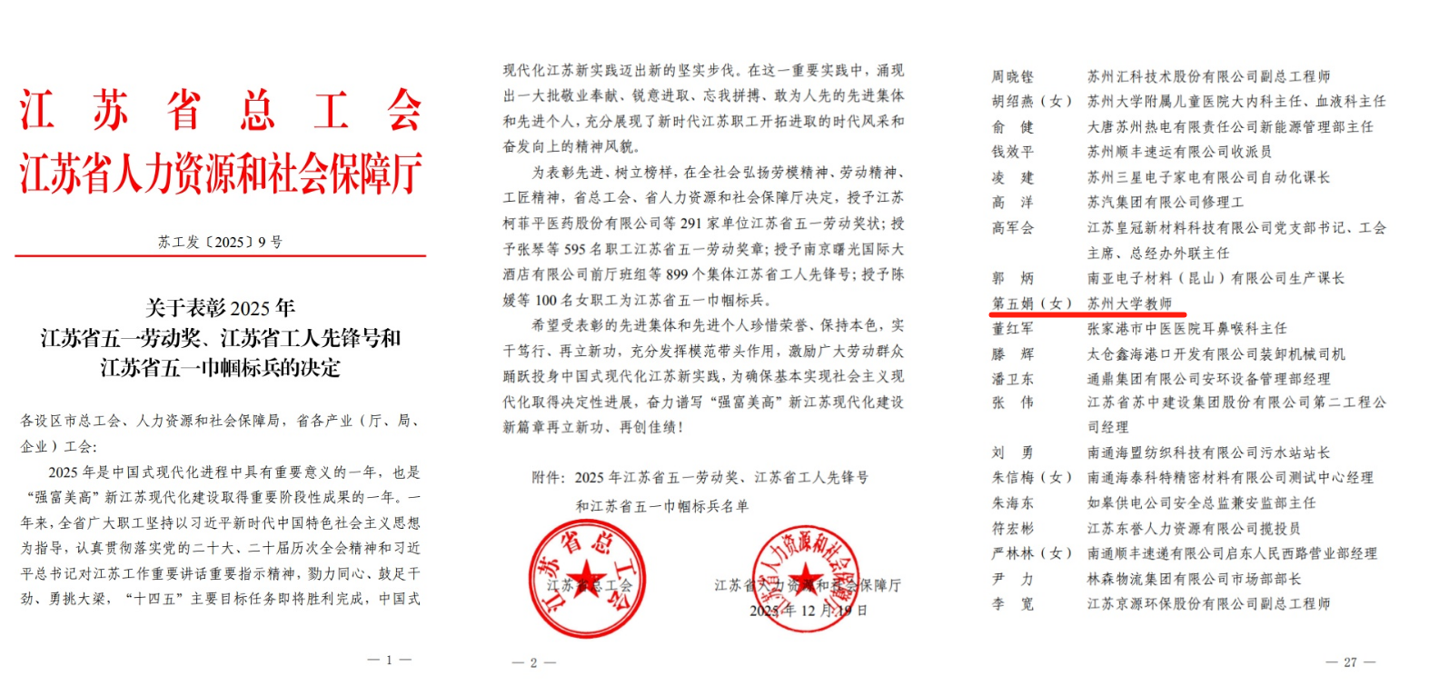 近日,江苏省总工会、江苏省人力资源和社会保障厅发布《关于表彰2025年江苏省五一劳动奖、江苏省工人先锋号和江苏省五一巾帼标兵的决定》,我校第五娟教授被授予“江苏省五一劳动奖章”。