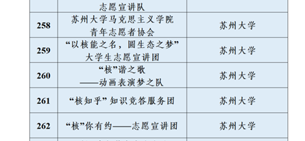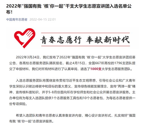 2022年4月15日,中国青年志愿者官网发布通知,由苏州大学放射医学与辐射防护国家重点实验室选送的三队“强国有我,‘核’你一起”大学生志愿讲团全部组团成功入选。