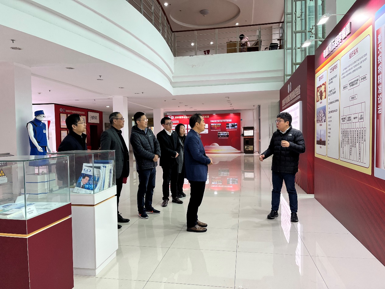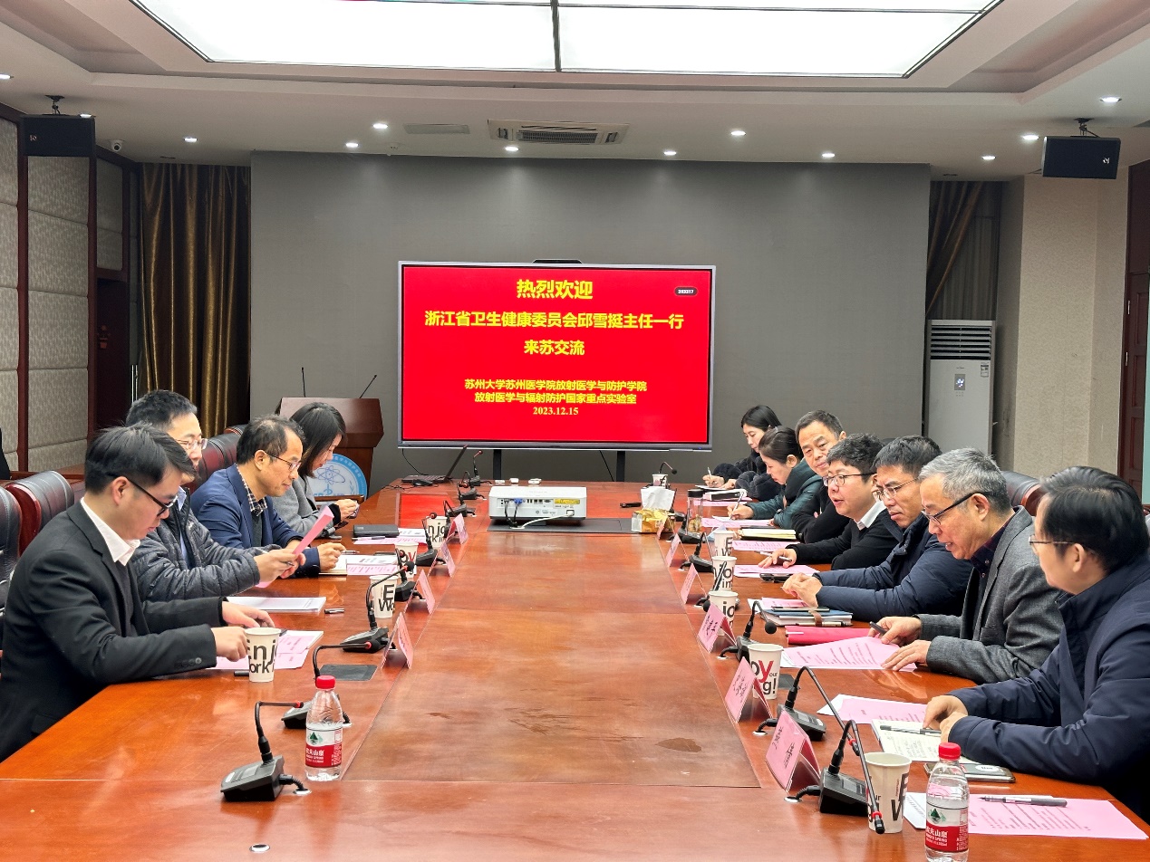 2023年12月15日上午,浙江省卫生健康委员会医学科技教育发展中心主任邱雪挺一行来访苏州大学放射医学与辐射防国家重点实验室,出席本次交流会的还有浙江省卫生健康委员会科教中心副科长朱斐、浙江省肿瘤医院副院长朱骥、科研部主任李清林,放射医学与防护学院党委书记王成奎、院执行院长曹建平,放射医学与辐射防护国家重点实验室主任、学院副院长王殳凹,副院长华道本和史海斌,国重室综合办主任徐加英等。会议由曹建平主持。