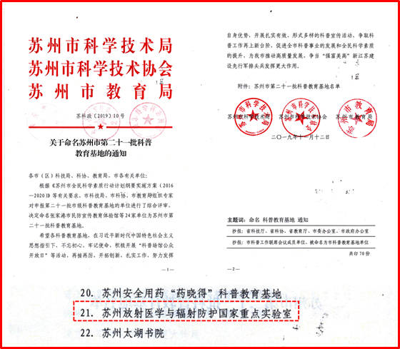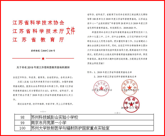 为广泛普及核科学技术和放射医学知识、宣传绿色核能发展理念,全面提升全民科学素质,促进科学普及与科技创新协同发展,苏州大学放射医学与辐射防护国家重点实验室积极响应科技部、中国科协、省科协等多部门号召,在2019年分别开展“身在辐中,安全为重”——辐射安全文化宣传月、“身临辐境”放射医学与辐射防护国家重点实验室开放日、“安知非辐”——辐射健康知识科普暑期社会实践活动和暑期夏令营;“不负使命、与核同行”——弘扬核科学精神及应用科普等系列活动,累计参与人数达万人,深受广泛好评,2019年底先后获批江苏省及苏州市科普教育基地荣誉称号。