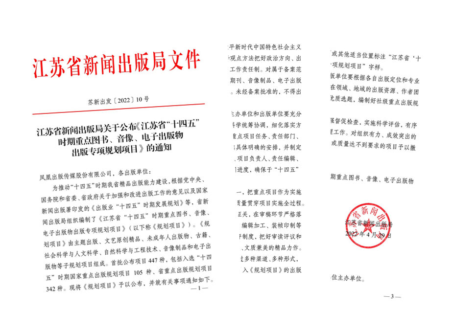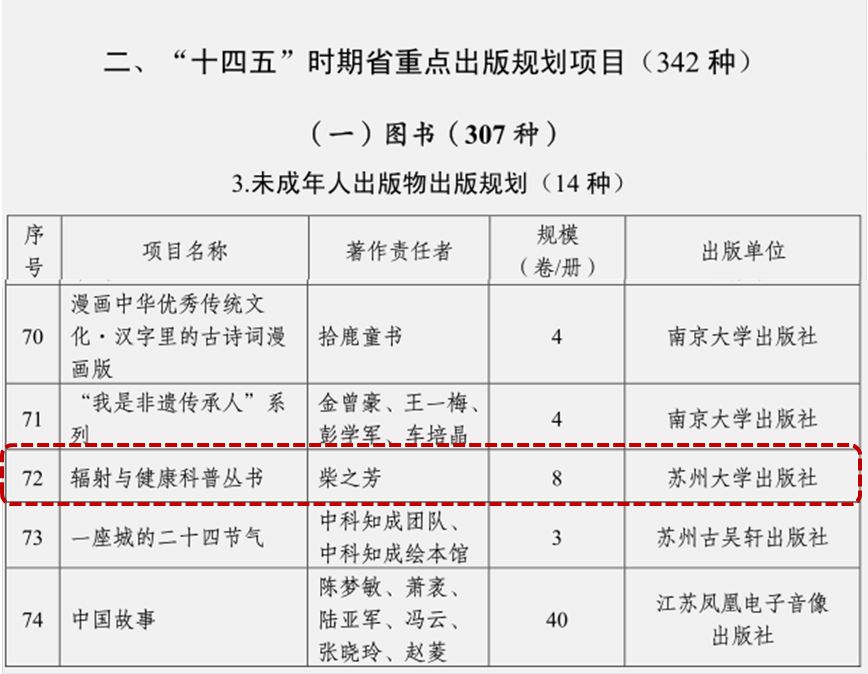 为推动“十四五”时期我省精品出版能力建设,根据党中央、国务院和省委、省政府关于加强和改进出版工作的意见以及国家新闻出版署印发的《出版业“十四五”时期发展规划》等,省新闻出版局组织编制了《江苏省“十四五”时期重点图书、音像、电子出版物出版专项规划项目》(以下称《规划项目》)。《规划项目》由主题出版、文艺原创精品、未成年人出版物、古籍、社会科学与人文科学、自然科学与工程技术、音像制品和电子出版物等子规划项目组成。首批公布项目 447 种,包括入选“十四五”时期国家重点出版规划项目 105 种、省重点出版规划项目342 种。由苏州大学出版社出版,放射医学与辐射防护国家重点实验室教师们主编的《辐射与健康科普丛书》入选省“十四五”时期重点出版规划项目。