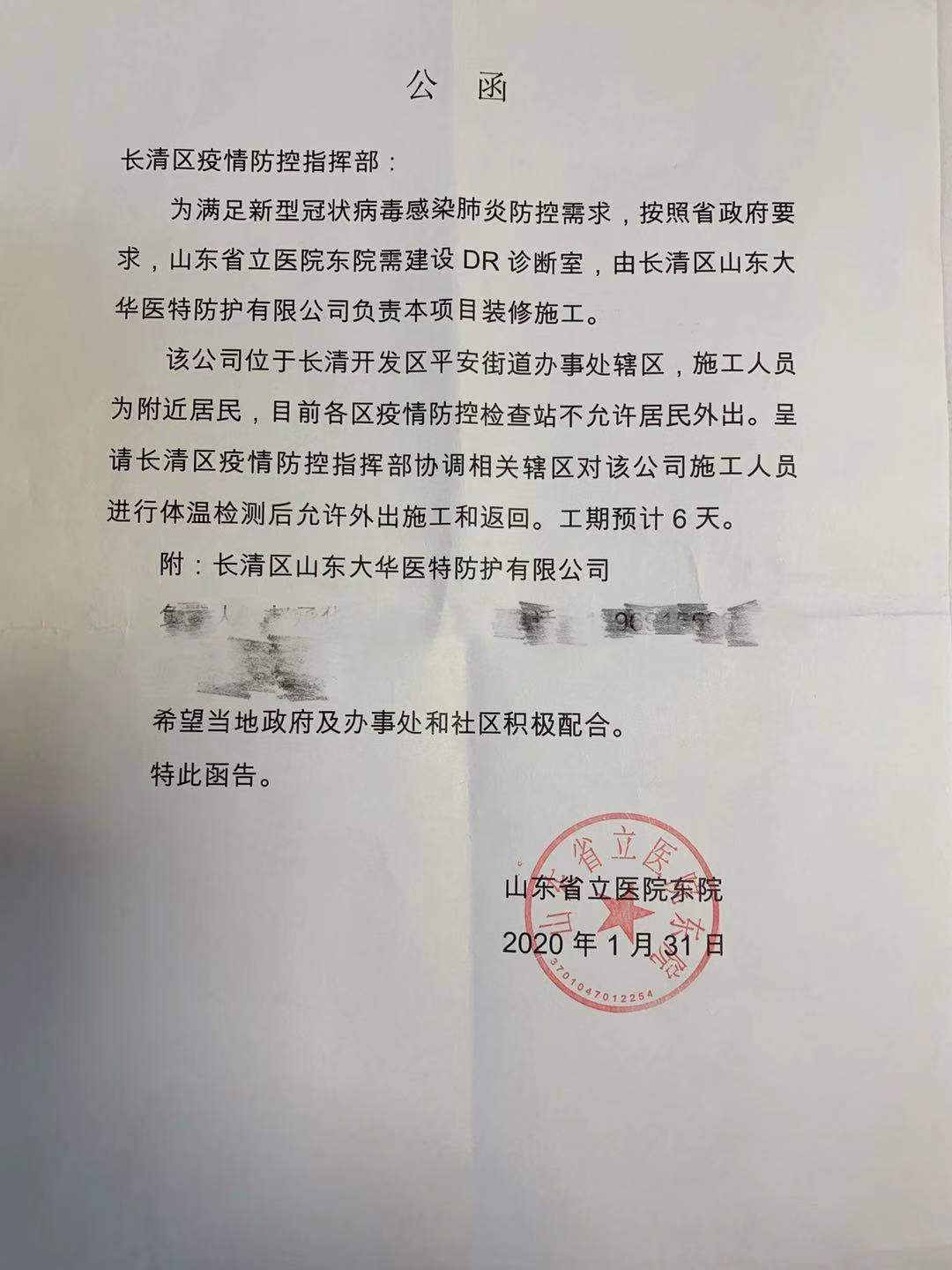 2020年1月31日,正月初七,公司接到一项紧急任务,要求立刻建设山东省立医院东院用于当前疫情防控的感染病区的放射机房。在面对抗击新型冠状肺炎疫情的紧急时刻,为筑起守护人民健康的防护屏障,公司第一时间做出决策“我们要做有担当的企业,为患者和医护人员筑起健康的防护屏障,我们要迎难而上,坚决圆满完成此次建设任务”,与此同时公司中的共产党员们在得知这一消息后主动提出“我是党员,我请战”的口号,在抗击疫情的紧急时刻我们的党员挺身而出、主动报名参战,并积极号召公司其他同事一起加入到此次抗击疫情的建设中去。公司成立了一支由党员、预备党员为主的技术过硬、健康体检合格的山东省省立医院施工小组,紧急制定项目建设方案以及应急防控预案。