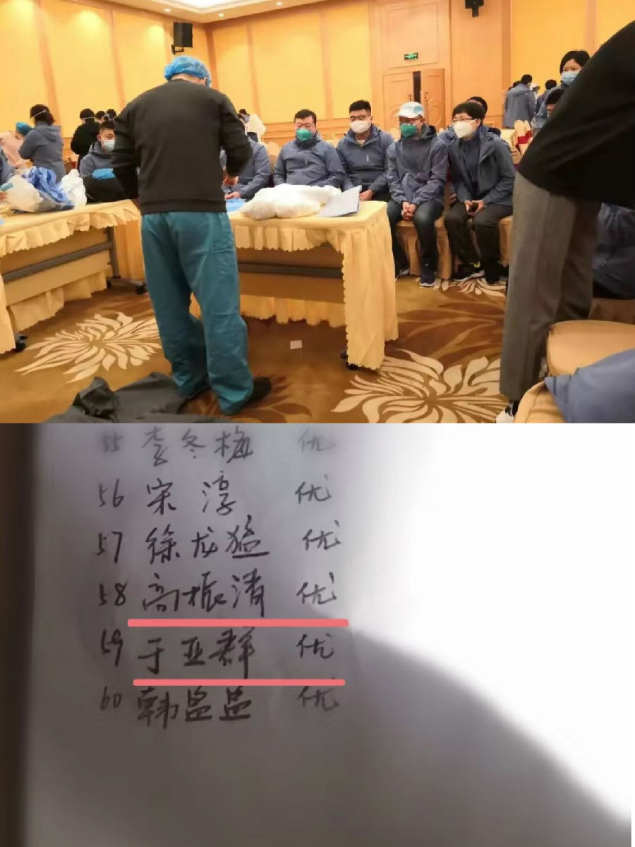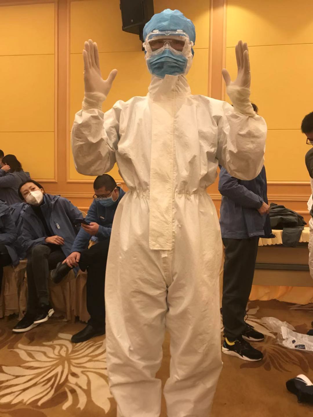 1月31日。上午,我们顺利通过了穿脱防护服的考核,亚群、振清两位年轻的战友表现十分优异,为他们骄傲!我们的支援地为两幢被改建的宿舍楼,收治疑似病人。我和三位战友的排班从明晚开始,每班有11个医护,负责6层楼,每4小时一班,但是由于穿脱防护用品十分繁琐,每次进出病区要6至8个小时。由于时间紧,所有物品包括隔离防护用品都需自备。