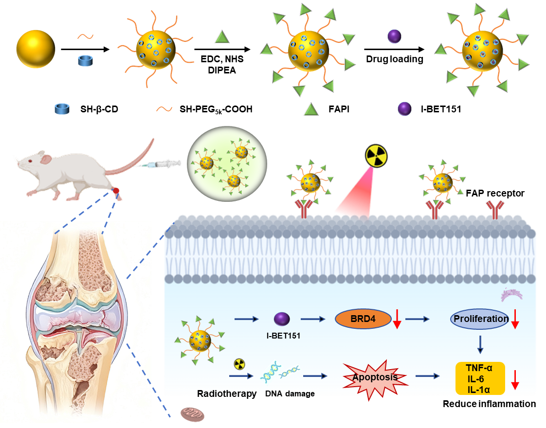 本研究设计并构建了一种靶向FAP的FAPI-Au-I-BET151纳米颗粒,成功用于成纤维滑膜细胞增殖的有效抑制。该纳米颗粒中纳米金(AuNPs)作为药物载体和放射增敏剂,FAPI靶向病变关节、β 环糊精(β CD)用于包裹BET抑制剂I BET151。纳米颗粒通过识别FAP特异性靶向成纤维细胞,并在炎症关节组织内富集。I-BET151的持续释放能有效抑制成纤维细胞增殖、减少促炎因子分泌。同时联合低剂量X射线照射,该纳米系统不仅能改善RA症状,还能最大限度降低不良反应,实现RA的协同治疗。该纳米体系为增殖性滑膜的精准高效治疗提供了有用手段。