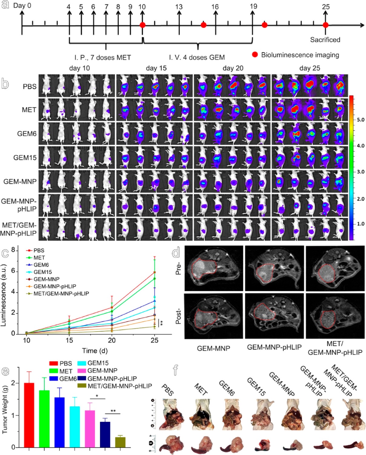 荷瘤鼠实验结果表明,经二甲双胍前期给药后,吉西他滨纳米药物GEM-MNP-pHLIP在肿瘤中的渗透和滞留能力显著增强,这可以通过磁性纳米颗粒对肿瘤磁共振成像对比度的增强得到证实。而生物发光成像实验则清晰地展示了,上述联合用药策略及先进的靶向药物递送对胰腺癌起到了显著抑制作用。