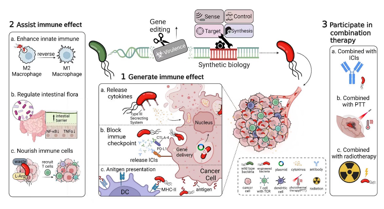 苏州大学放射医学与辐射防护国家重点实验室,放射医学与防护学院杨凯教授团队对近年来参与免疫治疗的工程化细菌应用进行了归纳总结,并按工程化细菌改造方式和对应参与免疫治疗环节的角色进行了综述。相关成果以“Engineered bacteria in tumor immunotherapy”为题发表在国际知名医学期刊《Cancer Letters》上(中科院一区,IF=9.70)上。论文链接:https://linkinghub.elsevier.com/retrieve/pii/S0304-3835(24)00210-6