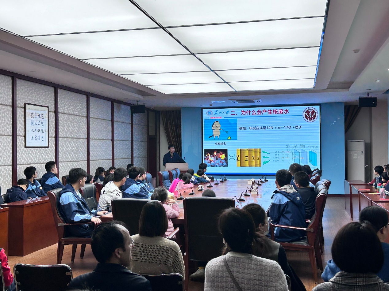 徐加英主任对参加本次活动的同学和家长表示热烈的欢迎,希望同学们通过本次参观学习对放射医学及其交叉学科有所了解,进一步增强自身对科学的兴趣,不断努力实现心中理想。同时在这次科普实践中学习和成长,感受科学的无穷的乐趣。接着,刘汉洲教授为同学们作了《核污水知识知多少?》的报告,他详细讲解了核污水的产生原理以及其中氚元素的危害性,带领同学们学习了核污水的重要知识。