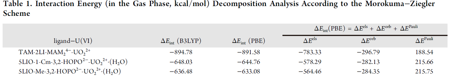 表1. 不同配体与铀酰的相互作用能