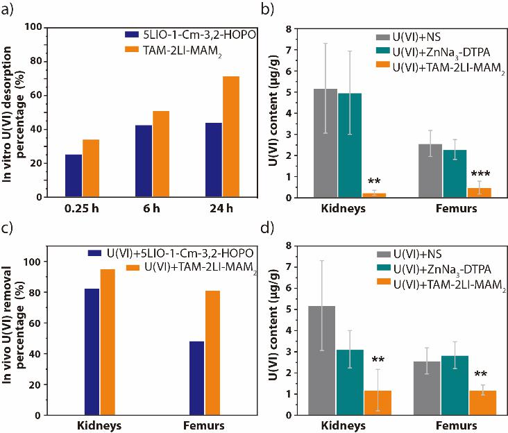 随后,团队在理论指导下设计合成了目标配体,并对配体及其铀酰配合物进行了一系列表征。晶体结构数据表明该配体可在赤道平面与铀酰离子形成稳定络合,且U-O键长与计算结果非常接近。光谱滴定实验结果证实TAM-2LI-MAM2在络合能力上优于四齿的5LIO-1-Cm-3,2-HOPO配体。在羟基磷灰石(HAP)对铀酰离子进行吸附后,使用上述两种配体进行解吸附实验,结果表明TAM-2LI-MAM2的解析率明显高于5LIO-1-Cm-3,2-HOPO,验证了其与铀酰络合能力的优势(图2a)。细胞毒性实验数据证明该配体自身毒性以及其与铀酰的综合毒性与当前临床药物ZnNa3-DPTA大致相当,细胞促排实验结果也表明该配体具有非常好的促排效果。