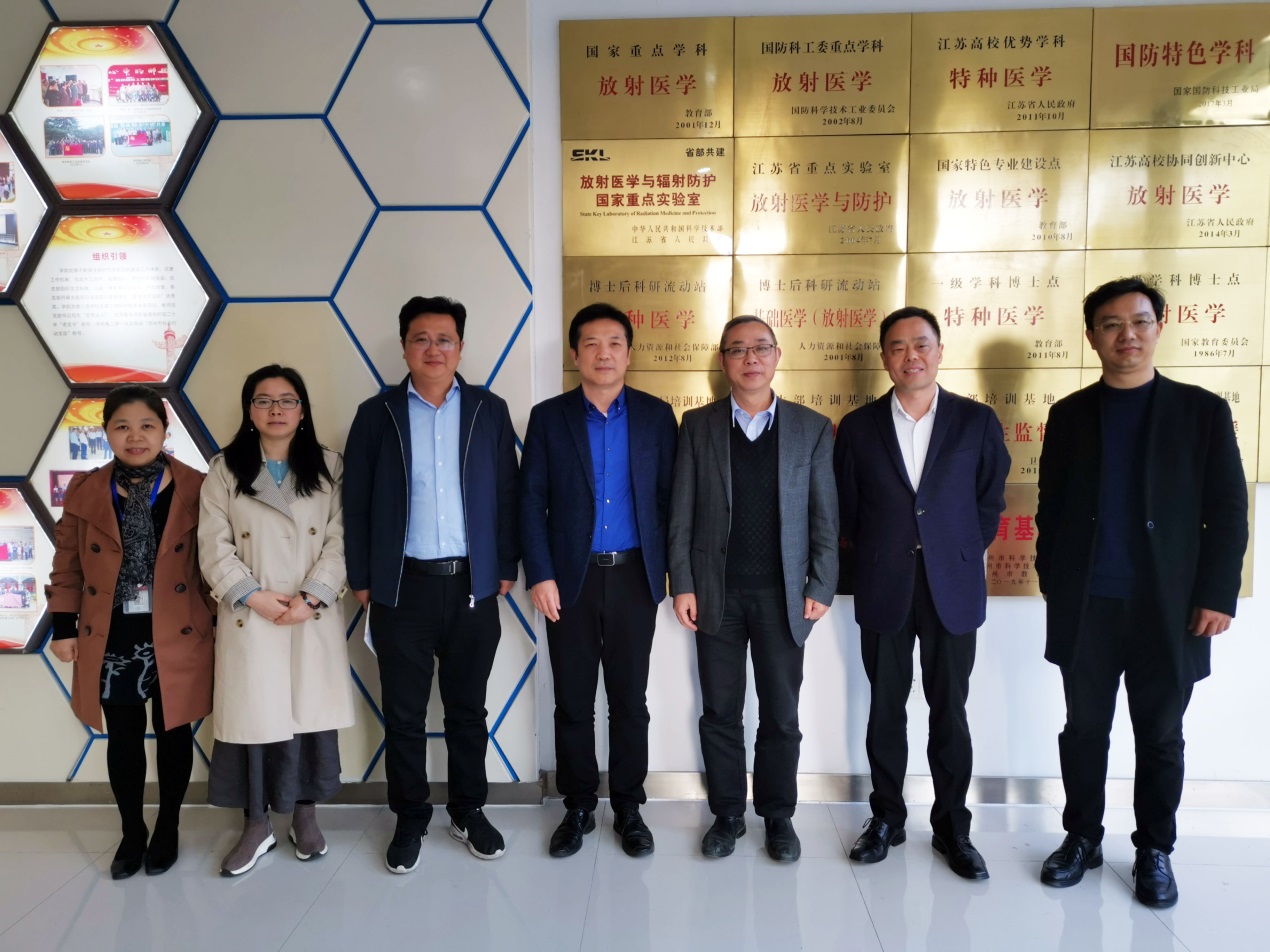4月9日下午,应苏州大学放射医学与辐射防护国家重点实验室副主任华道本教授邀请,南阳市第一人民医院鲁培副院长一行来苏交流。交流会在苏州大学独墅湖校区401楼一楼举行,参加交流的有南阳市第一人民医院副院长鲁培、河南省肿瘤分子生物学医学重点实验室主任徐全晓、南阳市第一人民医院放疗科主任张建东等;苏州大学医学部放射医学与辐射防护国家重点实验室副主任华道本教授、医学部放射医学与防护学院常务副院长曹建平教授、国重办公室主任徐加英教授、放医学院辐射纳米毒理研究中心崔凤梅教授等。会议由华道本主持。