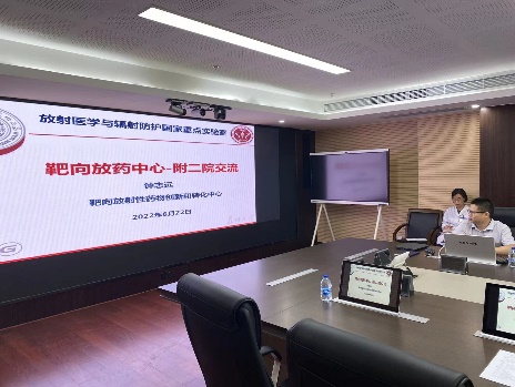 2022年6月22日下午,放射医学与辐射防护国家重点实验室与苏州大学附属第二医院和苏州大学放射医学与防护学院顺利举办放射性药物研究合作研讨会。附二院钱志远副院长、科技处张弘处长、药剂科潘杰主任、神经外科兰青主任、骨科周晓忠主任、科技处处长助理杨亚萍、放射医学转化中心主任助理肖莉、药剂科施爱明副主任、沈珠副主任、药物临床试验机构办公室王蒙副主任、药剂科苏存锦副主任药师、俞蕴莉主任药师及基建办公室杨阳工程师, 放射医学与辐射防护国家重点实验室华道本副主任、苏州大学放医学院靶向放药中心主任钟志远教授、副主任陈华兵教授、主任助理第五娟教授、放医学院王广林副教授、生物医用高分子材料重点实验室杨江涛等出席会议,会议由附二院科研处张弘处长主持。