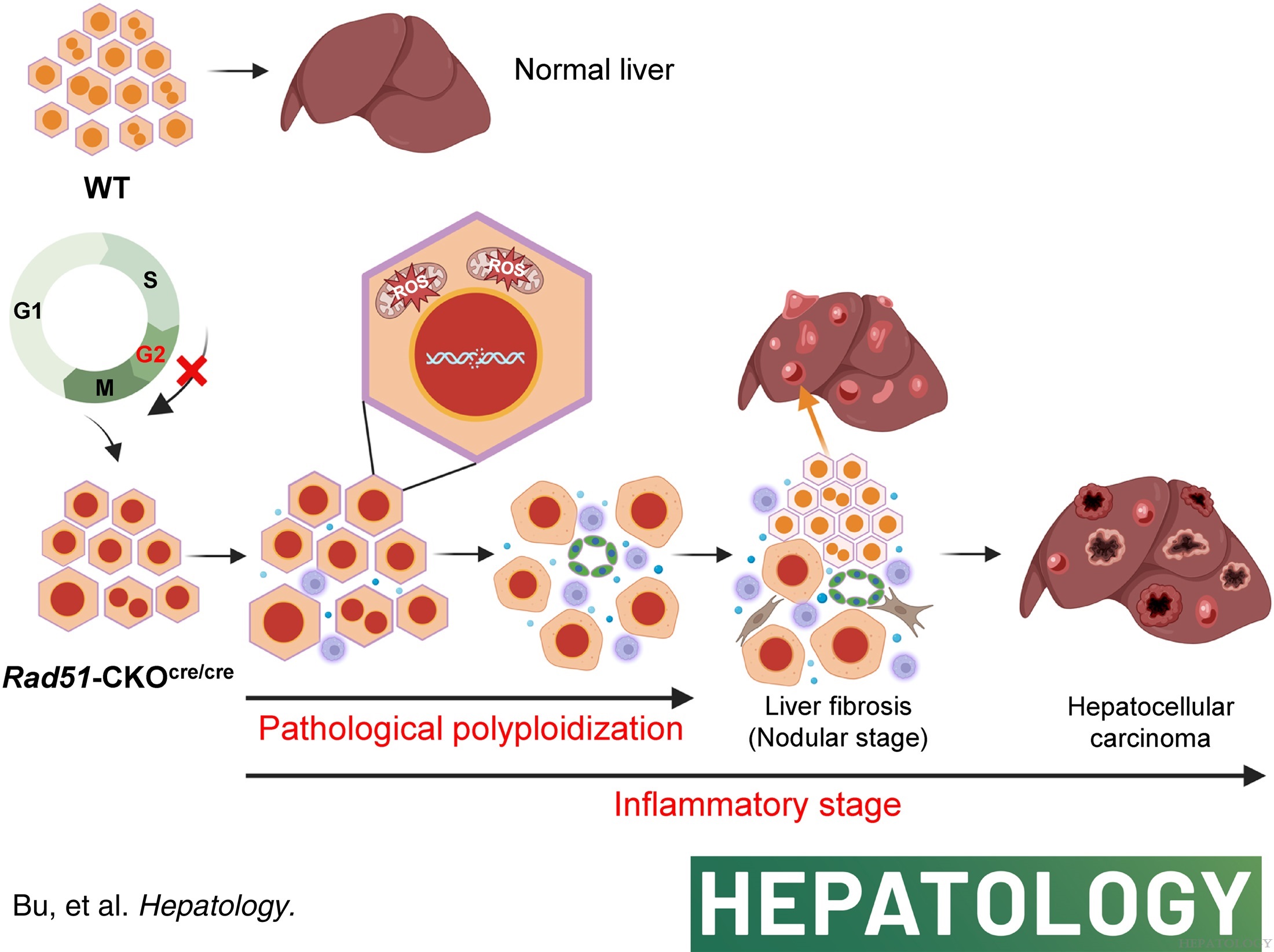 RAD51基因以及蛋白的名字起源于酵母中该基因突变导致的对电离辐射敏感性(radiation sensitivity),是高度保守的DNA修复蛋白,在同源重组修复过程中不可或缺。由于全身敲除小鼠早期胚胎致死,限制了对RAD51在器官发育中的作用和其生理功能的认识。肝脏是体内物质能量代谢的中心站,具有强大且重要的生理功能。随着年龄增长或在慢性肝病的影响下,肝脏会逐渐呈现出衰老特征,表现出肝再生障碍、慢性炎症、纤维化等,影响肝脏正常生理功能的发挥。研究团队发现RAD51在小鼠肝脏发育旺盛阶段以及肝再生过程中高表达,随年龄增长表达下降。研究团队利用Rad51-Flox结合Alb-Cre小鼠构建了肝细胞特异性敲除Rad51的小鼠模型(Rad51-CKO),以评估Rad51在小鼠肝脏发育和再生中的功能。 发现Rad51-Flox; Alb-Cre+/+小鼠(Rad51-CKOcre/cre)肝细胞呈现高度单核型多倍性,6-8周龄时多数肝细胞就变成16倍体或32倍体,并逐渐获得一系列病理性特征,包括再生能力障碍、DNA损伤累积、氧化压力升高和细胞衰老。衰老的多倍体肝细胞表达衰老相关分泌因子,导致大量免疫细胞浸润,使肝脏长期处于慢性炎症环境中。3月龄的Rad51-CKOcre/cre小鼠中即可观察到严重的自发肝纤维化以及广泛的胆管反应,即胆管上皮细胞向肝细胞的转分化及不断增殖。Rad51-CKOcre/cre小鼠肝脏中新生的细胞由于低表达Alb及Alb-Cre而保留了Rad51,这种细胞增殖旺盛,恶性程度不断升高,最终导致肝细胞癌的发生。此研究还通过AAV8-TBG-Cre探讨了成体肝细胞敲除Rad51对肝脏的影响。缺失RAD51的成体肝细胞应对部分肝切除时虽能进行DNA复制,但遭遇G2期阻滞,导致肝细胞分裂中断和倍性增加,提示Rad51-CKO小鼠肝细胞倍性的不断增加是内复制的后果。