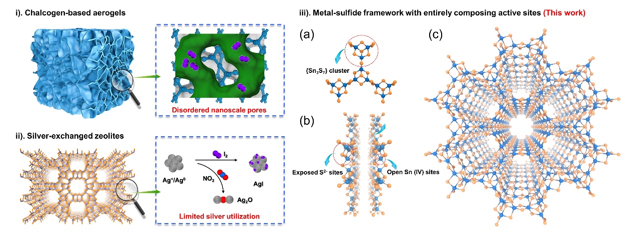 图1. 两类传统材料硫基气凝胶(i)和银基沸石(ii)的不足和本工作中锡硫化物材料碘的设计理念与结构示意图