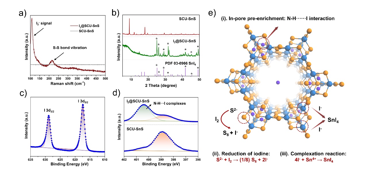 研究人员进一步通过先进谱学深入探究吸附机理。拉曼光谱表明吸附后的碘主要以I3-的形式存在,此外,在218 cm-1观察到S-S的振动峰进一步表明吸附过程中S2-与I2发生了氧化还原反应,并生成了单质硫。X射线衍射分析表明吸附后的产物中有SnI4。基于此,我们推断该吸附过程的反应为(NH4)2Sn3S7+I2→NH4[I−•I2]+SnI4+S8。X射线光电子能谱也同样表明结构中的铵根离子与碘存在一定的作用力(图3)。值得一提的是,该材料具有可大量合成、原料廉价、反应简单的优点,有望进一步推广应用。