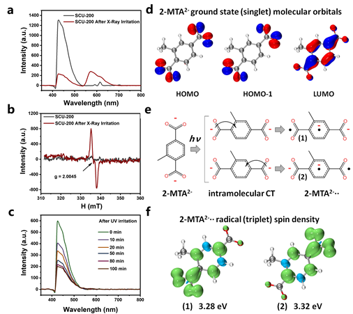 对比紫外和X射线作用的荧光光谱,该团队发现SCU-200可以选择性识别高能射线。EPR实验表明材料在产生新峰时伴随着自由基的生成。通过DFT理论计算,该团队认为MOF的框架结构和共轭苯环的作用下,配体在参与配位后更能稳定住辐射诱导的自由基,从而能够观察到新的荧光。
