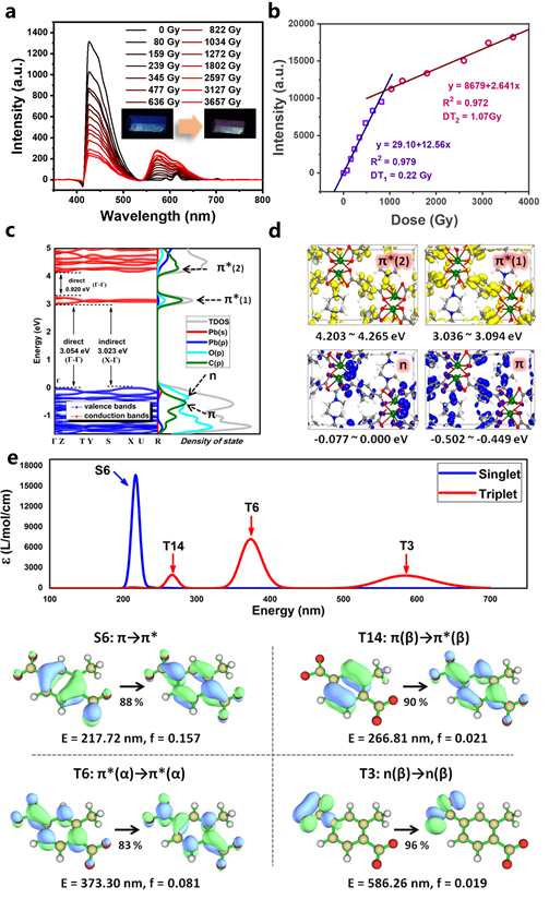 该工作以Pb元素为MOF金属中心,使材料拥有高X射线阻滞系数(比传统材料高两个数量级)。根据软硬酸碱理论,铅与2-甲基对苯二甲酸配体合成了大尺寸的MOF单晶(SCU-200)。该工作在研究SCU-200的闪烁体性能时,验证了该材料X射线激发光谱(XEL)与剂量率呈良好的线性关系。同时,XEL呈现蓝色荧光下降,红色荧光上升的特殊现象促使该团队进一步地探索材料荧光与所受剂量关系。
