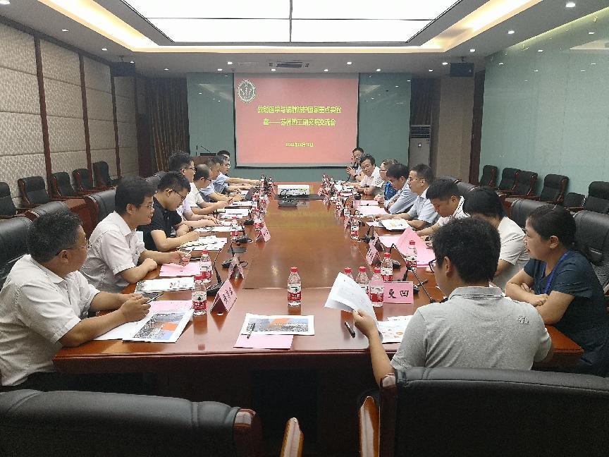 8月10日上午,姑苏区政府副区长俞锋和苏州热工院冯文彪副总经理一行到苏大放射医学与辐射防护国重室交流,共同推动名校名企合作。交流会在苏大独墅湖校区一楼会议室举行。参加交流会的有姑苏区人民政府副区长俞锋、经济与科技局副局长张浩;苏州热工研究院的冯文彪副总经理、环境保护与辐射安全中心的黄彦军研高;苏州大学科学技术研究院党委书记蒋敬东,放射医学与辐射防护国家重点实验室主任、放射医学与防护学院的院长、柴之芳院士、党委书记王成奎、国重室副主任华道本、副院长王殳凹和周光明、分子影像中心副主任李桢、辐射纳米毒理研究中心主任助理第五娟、国重室综合办徐加英、院综合办朱本兴等。会议由蒋敬东书记主持。