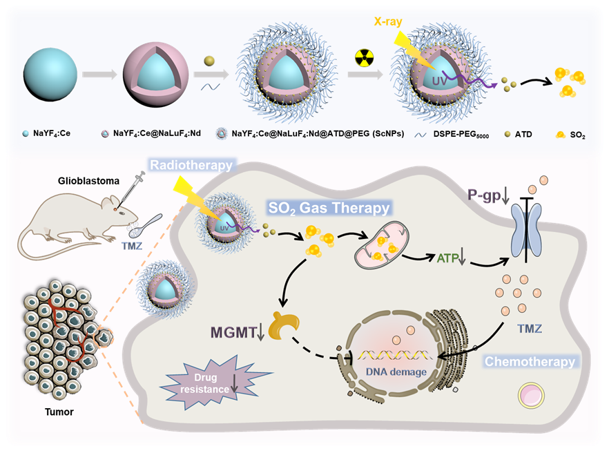 在上述工作基础之上,研究团队以纳米探针为载体负载前药分子,通过X射线控制前药分解以及SO2释放,同时降低了胶质母细胞瘤放化疗的耐受性。研究结果表明,所释放的SO2气体一方面通过脂质过氧化作用损伤肿瘤细胞的线粒体,影响ATP酶活性,进而降低耐药相关蛋白P-糖蛋白(P-gp)的表达,抑制肿瘤细胞的药物外排;另一方面降低肿瘤细胞DNA损伤修复蛋白O6-甲基鸟嘌呤-DNA甲基转移酶(MGMT)的表达,抑制DNA损伤修复,从而同时克服放化疗耐受性。本研究为克服胶质母细胞瘤放化疗耐受性提供了新视觉和新思路。