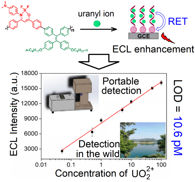 图1.聚集诱导发光(AIE)活性聚合物点(Pdots)ECL探针用于环境中铀酰的高灵敏度便携式监测。