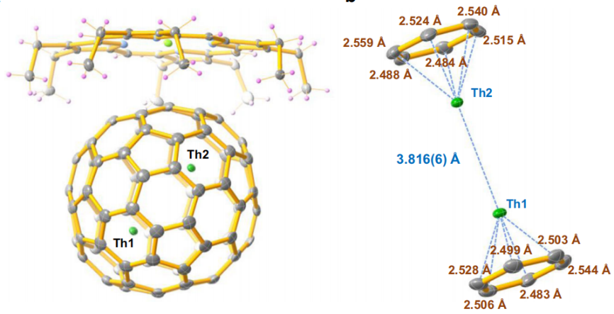 研究团队首先使用真空电弧放电法合成内嵌Th的一系列内嵌金属富勒烯化合物,并分离纯化得到了双金属内嵌富勒烯Th2@Ih(7)-C80。单晶X-射线衍射法确认其分子结构为Th2@Ih(7)-C80,晶体结构中金属Th原子在碳笼内部高度有序,其中Th1-Th2的距离为3.816 Å。