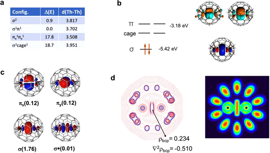 对Th2@Ih(7)-C80中Th-Th键的电子构型分析时发现,Th-Th键为σ2型键,但pi轨道成键也对该键形成有重要贡献,其有效键级(EBO)为0.99。由于客体和碳笼主体之间的六电子转移,Th2单元向碳笼转移一定数量的电子后,剩余两个电子存在于主要由Th的价层轨道形成的分子轨道中,进一步证实了钍离子在低能态时的氧化态为+3。