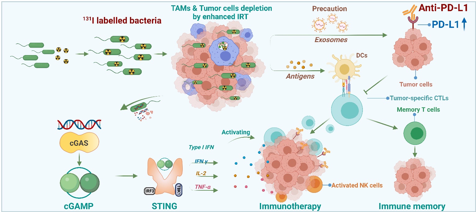 细菌介导的抗肿瘤治疗因其天然的肿瘤靶向性和良好的免疫激活特性而受到广泛关注。活菌和灭活菌都能诱导先天免疫和适应性免疫,进而改变肿瘤免疫微环境。在本研究中,我们使用125I/131I对灭活细菌载体进行放射性(125I-VNP/131I-VNP)。这种放射性标记灭活菌具有尺寸优势,能在肿瘤部位长时间滞留,对实体肿瘤产生强有力的杀伤作用。此外,免疫细胞可以识别细菌上与病原体相关的分子模式,吞噬并摧毁细菌,分泌细胞因子,触发更特异性的适应性免疫。与此同时,细菌DNA可以激活cGAS-STING通路,通过上调I型干扰素,促进T细胞和NK细胞的抗癌活性,从而达到抗肿瘤免疫应答的辅助作用。因此,我们设计的131I-VNP可以同时激活先天免疫的cGAS-STING通路和促进适应性免疫治疗的DC细胞成熟等多种免疫反应。在联合检查点抑制剂αPD-L1后,131I-VNP可显著抑制原位结肠癌的生长,并产生免疫记忆保护作用。
