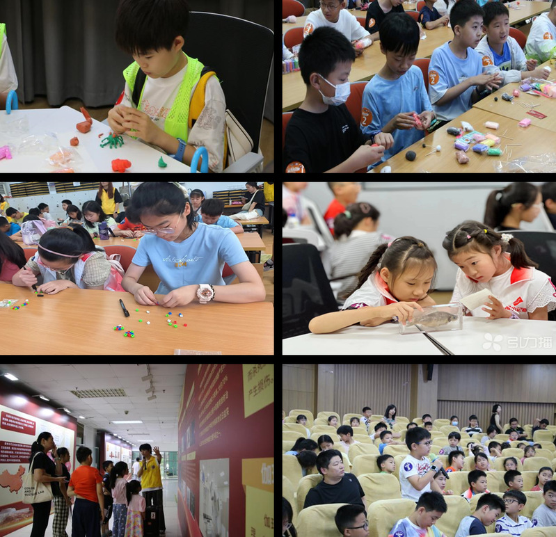 在特色科普互动课程中,同学们分组参与了多个科创研学小课堂,程侠菊老师为学生们带来了《浅谈免疫核弹》课程,将“核技术”与我们身体的免疫系统联系在一起,生动地解释了核技术是如何增强人体的免疫系统同学们用彩泥塑造出了免疫系统在身体中的作用。在《探秘核电站》“课程中,盛道鹏老师为同学们揭开了核能的神秘面纱,他不仅介绍了核裂变与核聚变这两个概念,还将核电站的发展历史一一呈现在同学们眼前,针对核电站安全防护知识,引导同学们正确认识核技术,消除对核能的恐惧。王仁生老师风趣且生动地带大家引入了《原子内的“积木”世界》,同学们了解了各种分子的微观结构,动手利用夸克包搭建起原子结构模型,逐步领悟了从最基本粒子——夸克,到原子核,再到原子分子,最终形成宇宙中各种物质的过程。王子昱老师的课程《奇妙的鱼类王国》从日本核污水与海洋鱼类的主题切入展开,展示了丰富多彩的鱼类世界,以鱼类与人类的悠久渊源开场,分享了古籍中有关鱼类的记载。最后,王老师还为同学们准备了生动有趣的观赏鱼。在全国科学家精神教育基地展厅里,“核星筑梦”大学生科普实践团的志愿者们向同学们介绍了科学家们的事迹,学习感悟“两弹一星”精神。