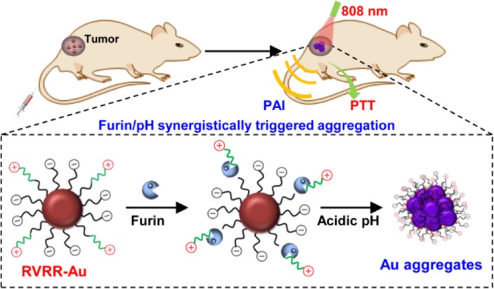 在最新的研究进展中,史海斌教授和高明远教授课题组创新性提出设计和构建了一种基于肿瘤微环境中高表达Furin酶和低pH特征的双重刺激响应性智能化金纳米颗粒(Au-RRVR),将其应用于在体肿瘤的光声成像和光热治疗中。体内外实验研究证实,该智能化金纳米颗粒(Au-RRVR)表面修饰的带正电荷RVRR多肽,在肿瘤微环境中可被Furin酶剪切,使得金纳米颗粒表面电荷发生变化形成两性离子。并且在肿瘤微环境低pH条件下,两性离子金纳米颗粒在肿瘤组织内被诱导发生聚集,聚集后的金纳米颗粒在近红外区出现明显的吸收峰,从而大大增强了肿瘤光声成像和光热治疗效果。该研究成果为金纳米颗粒在体可控诱导聚集应用于肿瘤诊疗中研究提供了新策略。