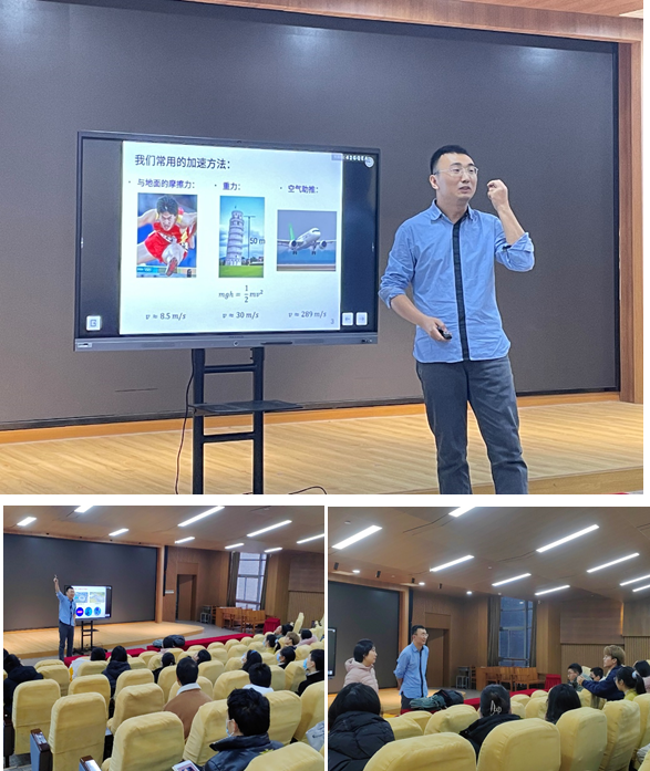 王老师毕业于清华大学物理系,从事辐射探测器的模拟与制作研究。曾多次参与国际合作实验,出国访问美国布鲁克海文国家实验室(BNL)、美国超导螺线管国家实验室(NSCL)、日本理化学研究所(RIKEN)等。讲座首先从日常生活中的加速现象与加速方式切入题目,用幽默生动的语言激发同学们的兴趣。接着,从加速器的用途、加速粒子的种类、加速粒子的方法这三个方面全面展开。此外,王老师还结合自己的求学及访问研究经历,普及了国内外加速器建设的现状,并给俱乐部的同学们留下了讨论的话题。他的讲解循循善诱、引人入胜,风趣幽默,同学们都聚精会神地听着老师的讲述,时常在老师的讲解中不由自主地露出的笑容。在交流互动环节,同学们积极主动就相关问题进行了探讨,比如:加速器是否在未来能够有新的形式?对于分子、中子等微粒并不带电,如何做到加速?加速器如何助力大家课题的开展?等等。王老师解答详尽、视野广阔,讲座现场同学们反响热烈。每位参加会议的同学都表示自己在本次讲座学习中收获颇丰,为接下来的俱乐部课题夯实了理论基础。