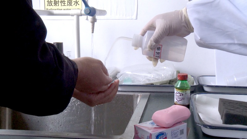 演练模拟了研究人员从事放射性核素131I实验,在实验过程中老师发现自己在实验时不慎将手套破裂了,造成放射性核素131I沾污了双手的突发情况。