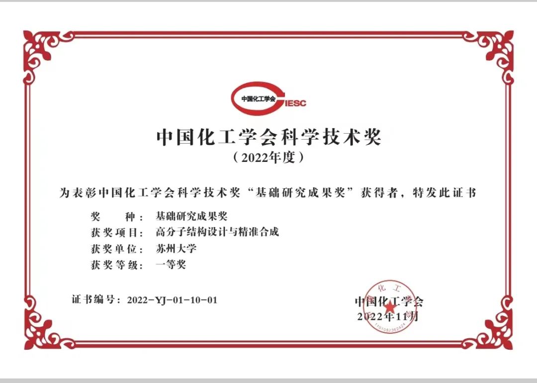 近日,中国化工学会在北京召开了第四十一届会员代表大会,会上公布了2022年度中国化工学会科学技术奖获奖名单。国重室张正彪教授牵头完成的“高分子结构设计与精准合成”项目获得基础研究成果奖一等奖,系学校首次获得。