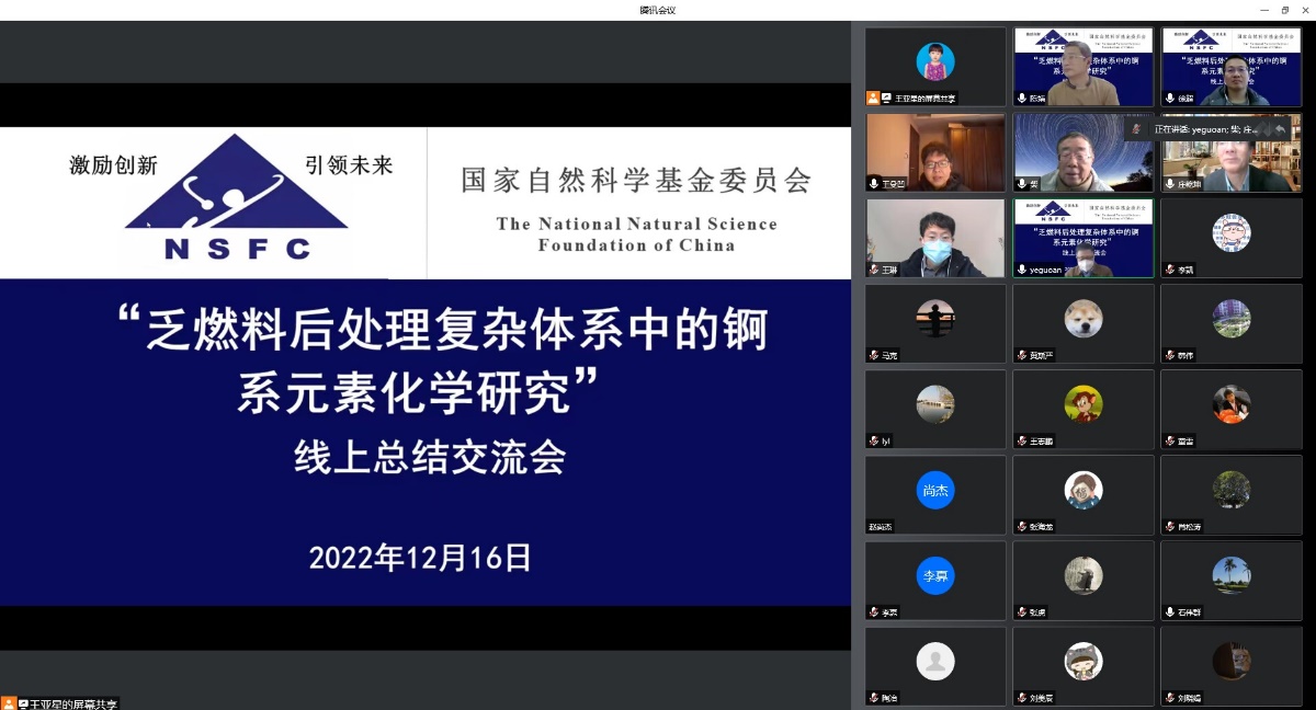12月16日,国家自然科学基金委重大项目“乏燃料后处理复杂体系中的锕系元素化学研究”2022年年度交流会在线上召开。国家自然科学基金委员会化学科学部庄乾坤处长、重大项目负责人苏州大学放射医学与辐射防护国家重点实验室主任、苏州医学院放射医学与防护学院院长柴之芳院士及各子课题负责人、研究骨干等20余人参加会议。