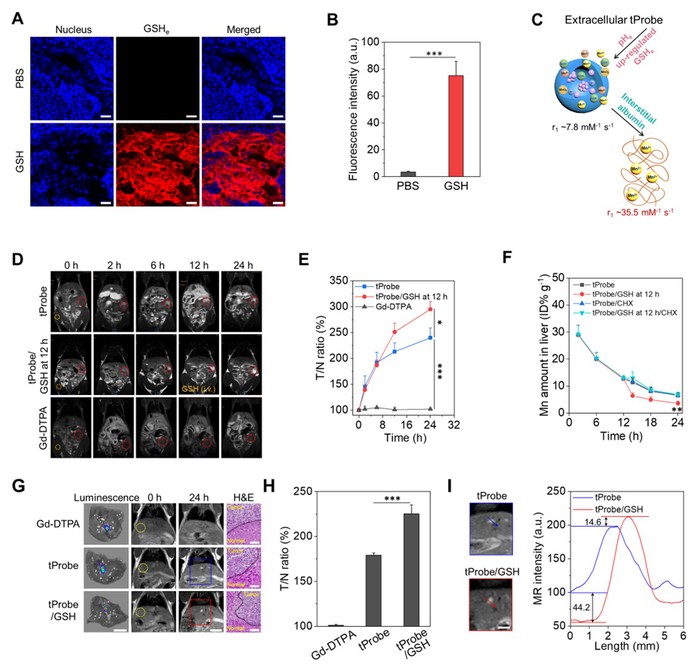 图4:(A、B)静脉注射GSH后瘤内GSH分布及荧光强度;(C)胞外tProbe激活、滞留、被白蛋白捕获示意图;(D、E)静脉注射GSH后tProbe在原位结肠癌的磁共振成像图片和信噪比;(F)第12 h静脉注射GSH后肝组织中的tProbe分布;(G-I)静脉注射GSH后tProbe在肝转移瘤中的磁共振成像图和信噪比。