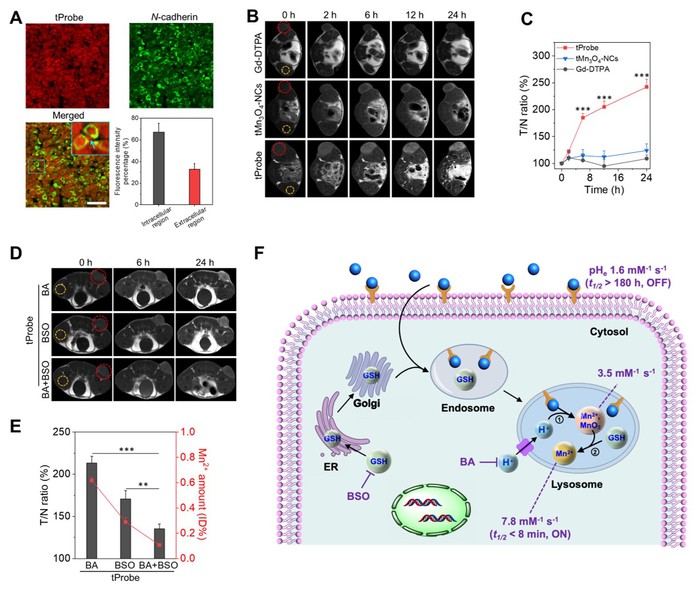 首先,采用单分子转铁蛋白作为纳米反应器,通过生物矿化法构建了载四氧化三锰的靶向性转铁蛋白纳米探针(tProbe,图2A-B)。在中性条件下稳定的tProbe半数降解时间为140 h,而在5.0 mM GSH/pH 5.0条件下其半数降解时间锐减至0.002 h(图2C),表明纳米探针的响应速率取决于胞内GSH浓度及酸性。通过对弛豫系数(r1)的测定发现,随着酸性的增强,tProbe的r1从0.6 mM-1s-1(pH 7.4)提升至1.6 mM-1s-1(pH 6.5),并进一步提高到3.5 mM-1s-1(pH 5.0),而加入GSH后tProbe的r1快速提升至7.8 mM-1s-1,其临界GSH响应浓度仅为0.04 mM(pH 5.0)(图2D),显示出tProbe具有GSH、pH双响应的多级信号放大功能(图2E)。