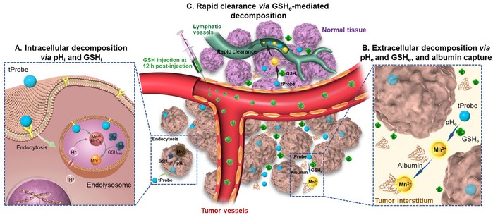 肿瘤磁共振成像对于肿瘤监测、疗效评估、手术导航有重大意义,利用造影剂提升肿瘤成像对比度是临床常用策略,但现有造影剂存在着肿瘤选择性差、成像对比度低等缺陷。近年来,利用肿瘤部位特殊的微环境特征(如微酸性、胞内高浓度谷胱甘肽GSH、过表达酶或蛋白等)设计的智能响应性造影剂能有效提升肿瘤成像对比度,但响应性造影剂的激活通常仅发生于肿瘤细胞内局部位置(如富集GSH的胞浆或溶酶体、酸性溶酶体),而肿瘤基质中则缺乏相关的刺激信号,反之亦然。同时,正常组织中造影剂引起的背景噪音,也严重限制了肿瘤成像的对比度。因此,发展具有高对比度肿瘤成像功能的新型磁共振探针是当前肿瘤成像研究的重点和难点。