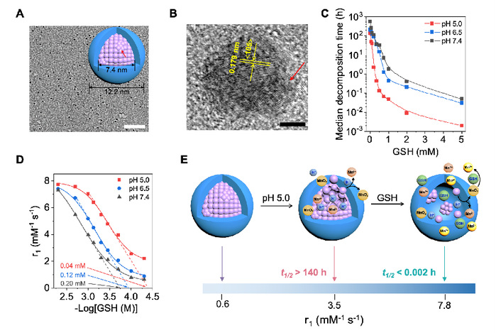 图2:(A)tProbe透射电镜图片;(B)tProbe高分辨电镜图片,红色箭头标注出晶格缺陷位置;(C)不同条件下tProbe半数降解时间;(D)不同条件下tProbe弛豫系数;(E)tProbe降解示意图。