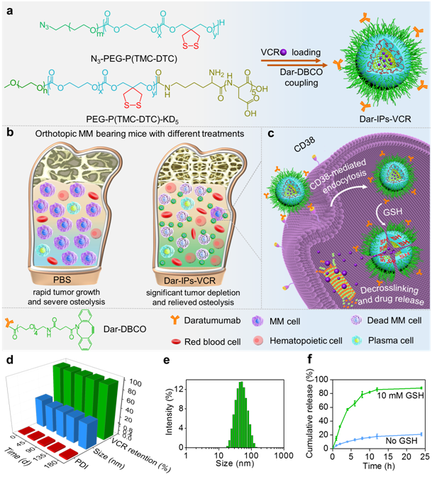 在最新研究中,钟志远教授团队设计构建了达雷木单抗修饰的免疫囊泡负载硫酸长春新碱(Dar-IPs-VCR),以实现安全高效的CD38靶向化疗并清除MM(图1)。Dar-IPs-VCR通过张力触动的点击化学反应后修饰得到,其具有抗体密度可调(每个IPs 上2.2, 4.4或8.7个Dar),稳定性高,尺寸小(43-49 nm),VCR负载效率高以及谷胱甘肽触发的VCR快速释放等优点。研究表明,Dar4.4-IPs-VCR具有强效的抗MM活性,在CD38阳性LP-1 MM细胞中的IC50为76 pM,与非靶向的Ps-VCR和游离VCR对照组相比分别降低了12和20倍。重要的是,Dar-IPs-VCR对正常细胞及人外周血单核细胞的毒性极小。