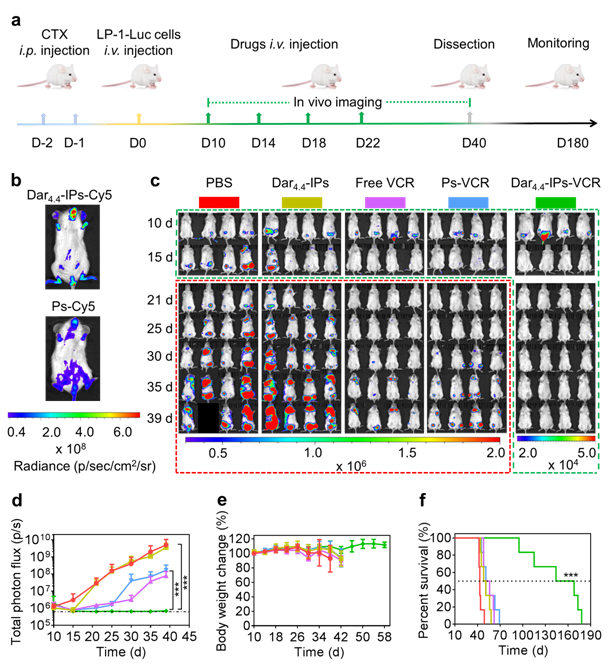 荷原位LP-1-Luc MM小鼠在经过4次静脉注射Dar4.4-IPs-VCR治疗后,体内的LP-1-Luc细胞得到了完全清除,有效缓解了小鼠的溶骨性病变并大幅延长了小鼠的生存期,中位生存时间由游离VCR和Ps-VCR组的51-52天延长至156天(图2)。整个治疗期间,小鼠体重持续稳定增长,且小鼠的骨骼及正常器官无见明显损伤。